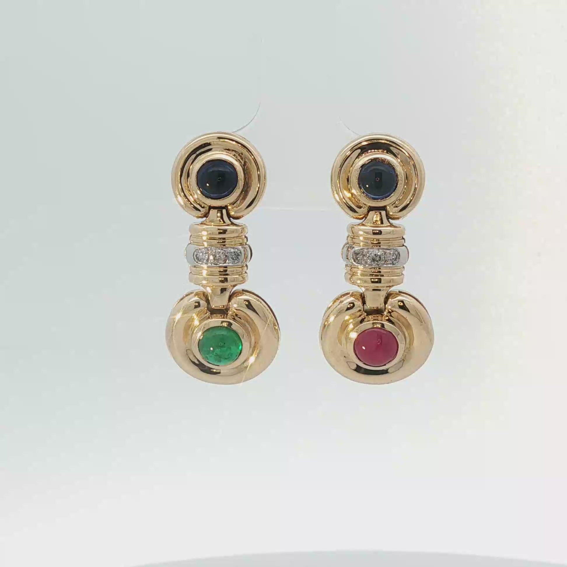 Elegante Ohrhänger aus 750er Gelbgold mit harmonischer Kombination aus Smaragd, Saphir und Brillanten (ca. 0,12 ct). Die feinen Steine setzen raffinierte Akzente und verleihen diesen Hängern zeitlose Eleganz. Mit einer Länge von 28,3 mm bieten sie die perfekte Balance zwischen Präsenz und Tragekomfort. Ein hochwertiges Schmuckstück für besondere Anlässe und als zeitlose Ergänzung zu Ihrer Schmuckkollektion.