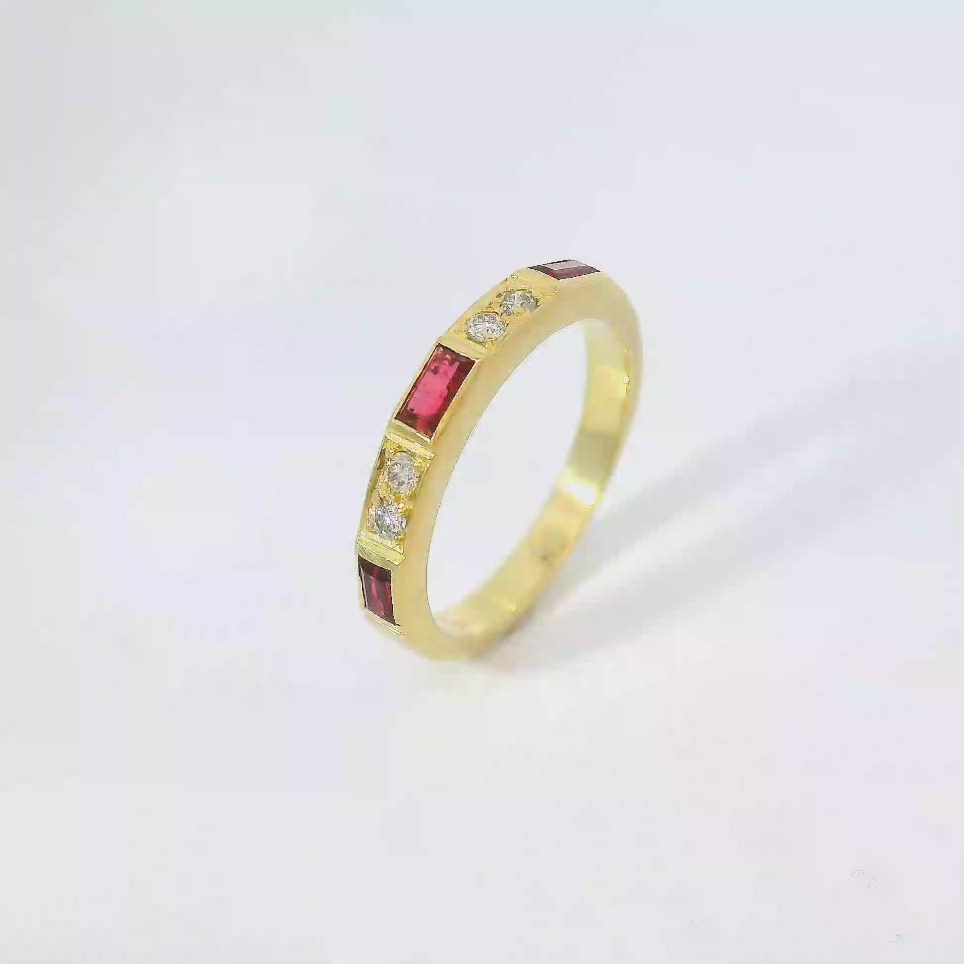 Dieser elegante Gelbgoldring präsentiert eine Reihe von quadratischen Rubinen ergänzt mit Brillanten. Die Steine sind transparent und zeichnen sich durch ihre rote Farbe aus. Das polierte Goldband ergänzt die Rubine perfekt. Dieser Ring ist ein luxuriöses Schmuckstück, das Raffinesse und Stil verkörpert. Ideal für Liebhaber edler Steine und klassischer Designs.